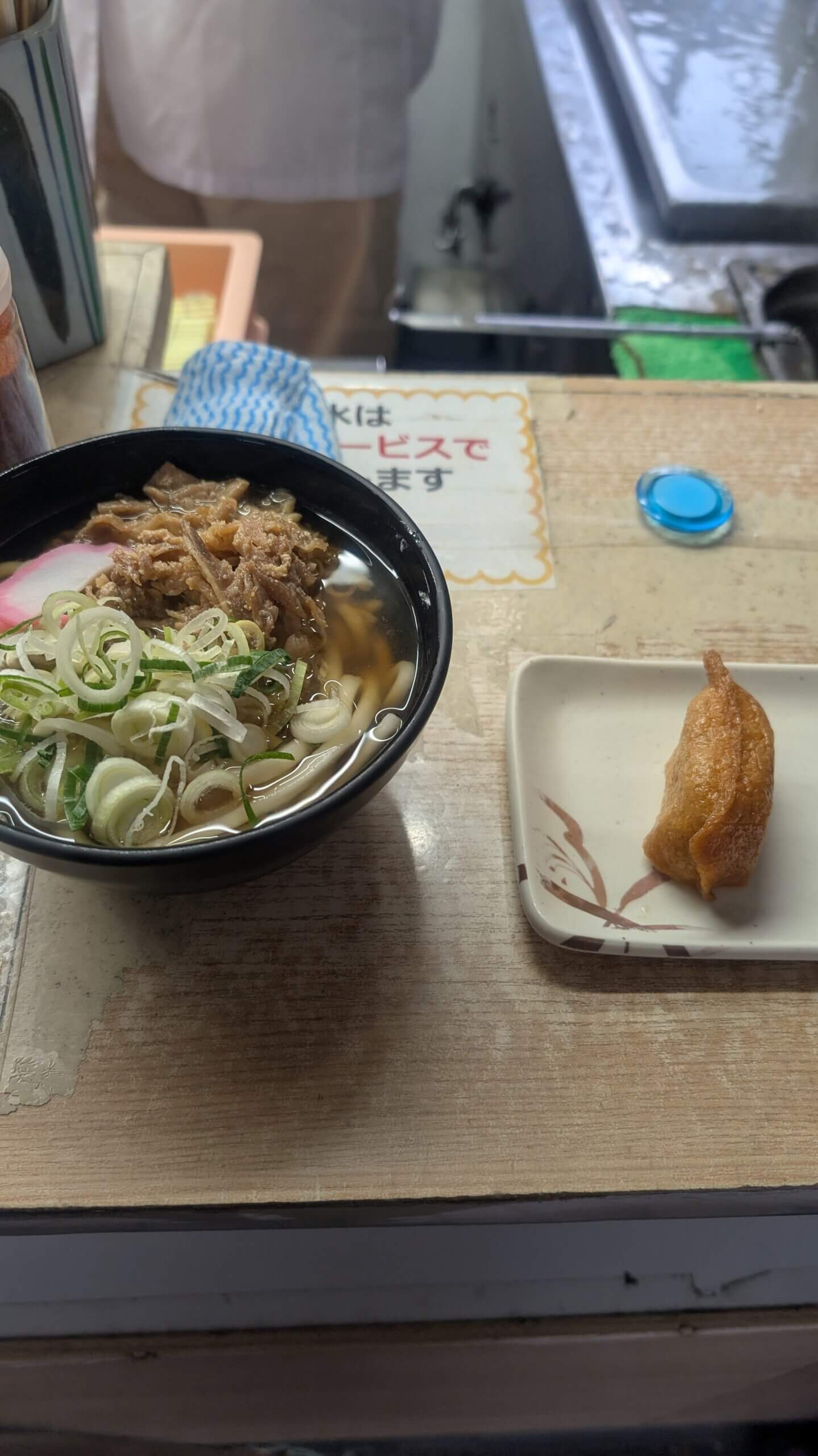甘辛く煮た鶏肉がたっぷり入ったかしわうどんを、立ち食いスタイルでいただきました。